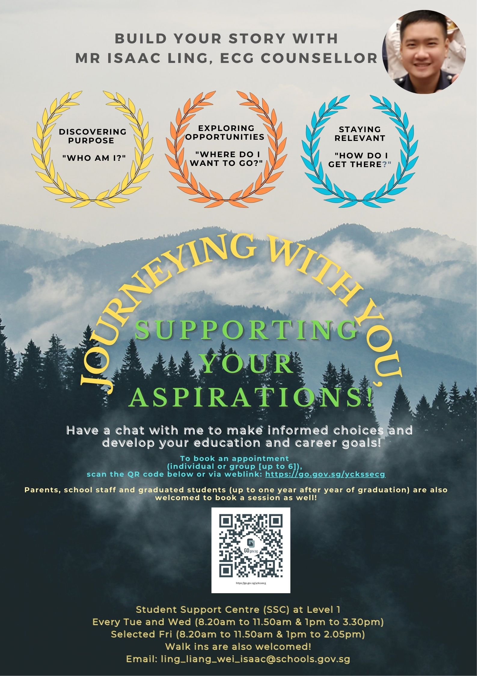Our school’s ECG Counsellor, Mr Isaac Ling, is stationed in our school every Tuesday, Wednesday and selected Fridays to provide ECG counselling and support students in making informed decisions on their education and career pathways. Students (and their parents) who would like to find out more about post-secondary education options, subject choices, career interests, or discover their strengths and interests, can have a chat with our ECG Counsellor. Mr Isaac also conducts in house workshops for teachers and provides individual and group counselling to students in decision making such that they can, in the future, contribute meaningfully to society through their future professions.